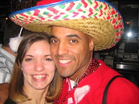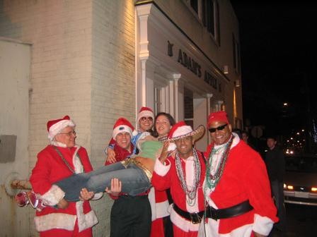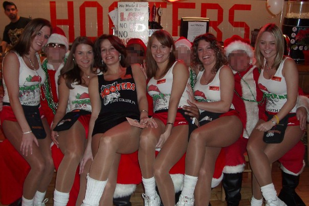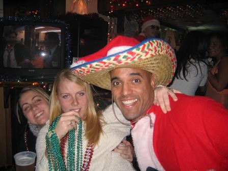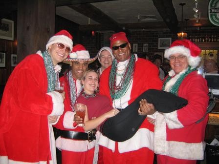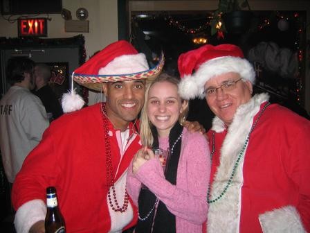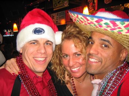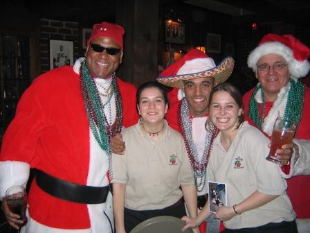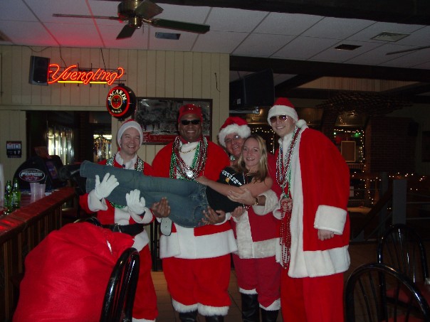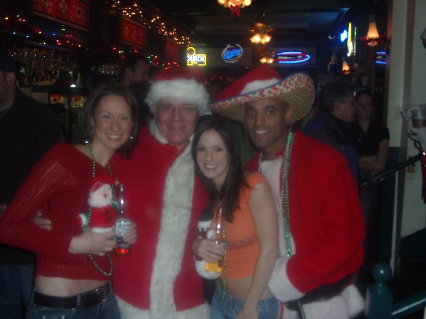 This whole thing started a decade ago in 2004 when five of us decided to don some Santa outfits and do a bar crawl. We gathered together at the Adam’s Apple where we took this great picture (from left to right: Jeff Deitrich, Larry Fall, Johnny Mateo, Kevin Hodge, Brian Allen). From there we headed to Hooter’s at the far east end of for the official start of our bar tour, gradually working our way westward. Along the way, we made a few friends.